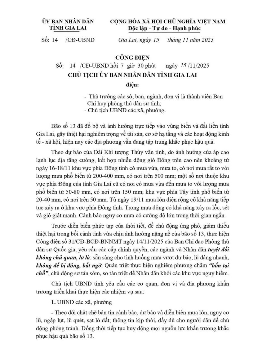 Thứ bảy, 15/11/2025 | 10:37 A- A A+ | CÔNG ĐIỆN Số 14/CĐ-UBND hồi giờ phút ngày 15/11/2025 của UBND tỉnh Gia Lai Chia sẻ Đọc bài Lưu