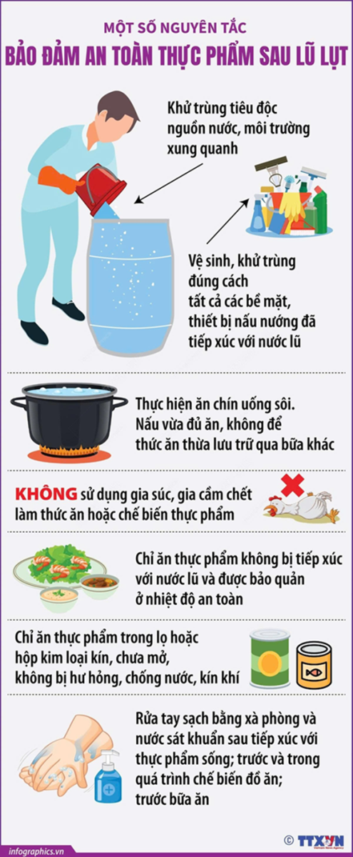 - Người dân tuyệt đối không sử dụng gia súc, gia cầm, thủy sản chết bệnh, chết không rõ nguyên nhân để làm thức ăn hoặc chế biến thực phẩm; không ăn lương thực thực phẩm sống đã bị ngập lụt; chú ý cần để riêng thực phẩm tươi sống với những thực phẩm chín. Có kế hoạch chủ động dự trữ các loại lương thực, thực phẩm chế biến sẵn, nước uống đóng chai, các loại vitamin, các hoá chất sát khuẩn của ngành y tế.
