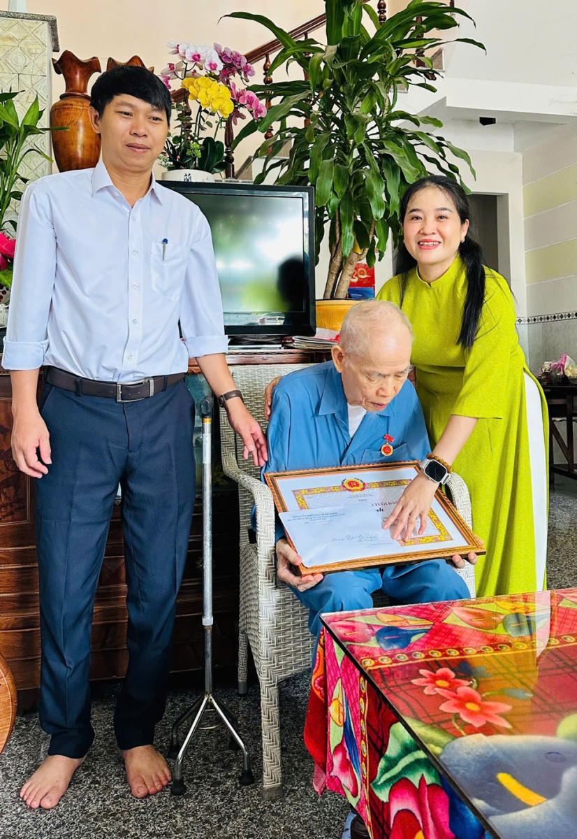 Lãnh đạo Đảng ủy phường trao tặng Huy hiệu 70 năm tuổi Đảng cho đảng viên Lê Dảnh (sinh hoạt tại Chi bộ Tổ dân phố Trần Phú) tại nhà riêng