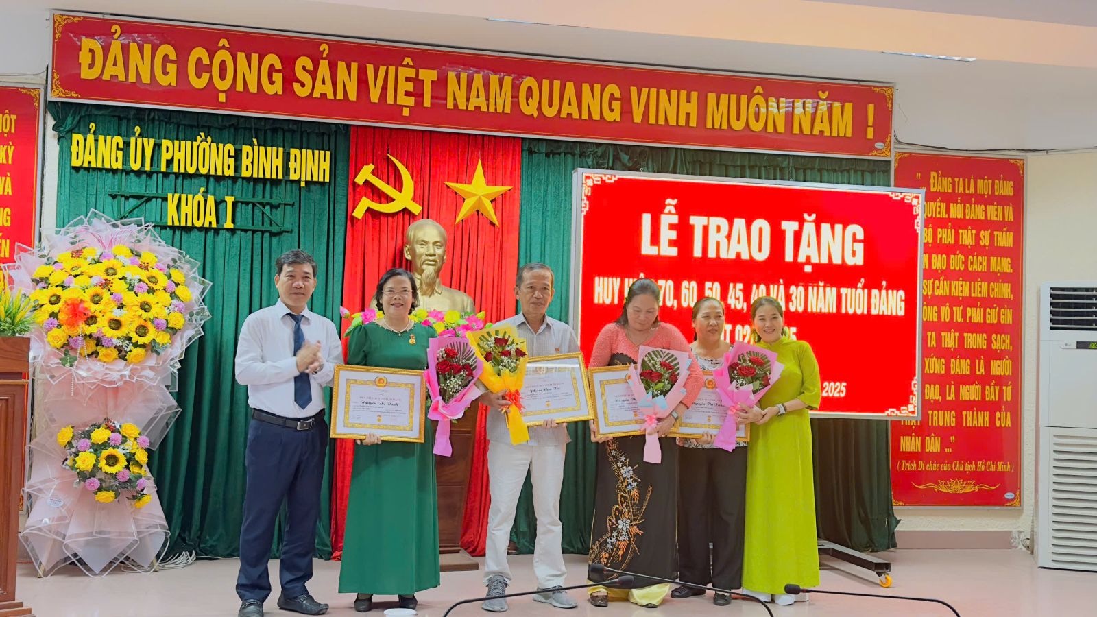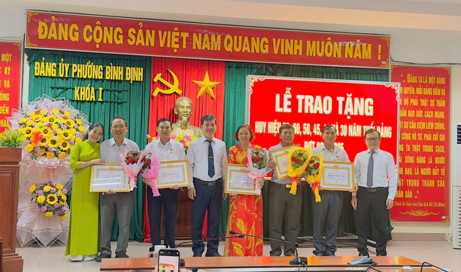 Bí thư Đảng ủy, Chủ tịch HĐND phường Bình Định Đào Xuân Huy và Phó Bí thư Thường trực Đảng ủy Lê Vũ Vân Kiều trao tặng Huy hiệu Đảng cho các đảng viên.